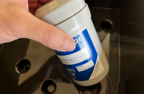 浄水フィルターの交換は給水タンクの下に押し込んで、回すだけなので交換も簡単です。初期設定時に行っているので、交換時もマニュアルなど見ることなく簡単に交換できると思います。