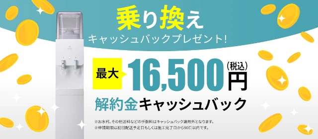 現在契約中の他社ウォーターサーバーを解約し、Locca(ロッカ)をご契約する方を対象に、特典として「他社解約にかかる解約金(違約金)の最大30,000円をキャッシュバックしています。